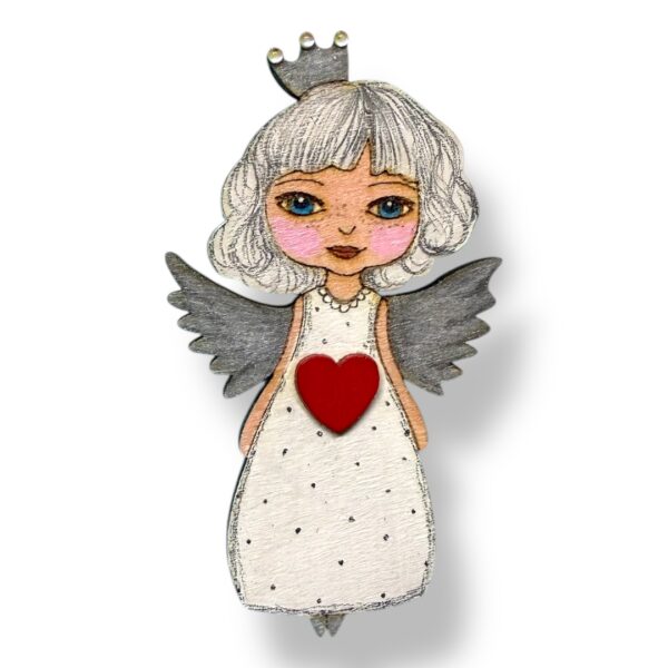 Kanna endaga kaasas killuke kaitset ja valgust. Pross kannab endas kaitseingli sümboli . Sobib kandmiseks nii pidulikel hetkel kui ka igapäevaselt. Tiivad läigivad hõbedaselt. Ingel on kasevineerist ja käsitsi maalitud ning lakitud. Ilmastikukindel. Peal pärlike. Pikkust 8 cm.