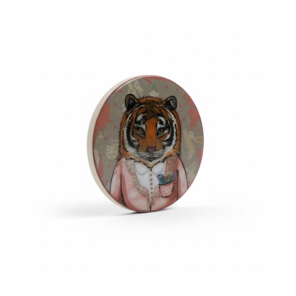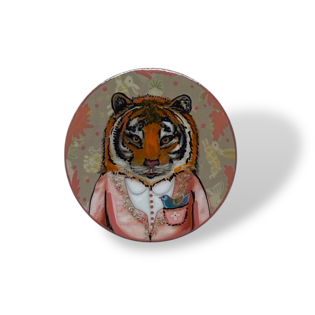 Asjalikul proua Tiigril on ikka väike sõber Lind taskus kaasas. Pilt on trükitud ja pross on 5 cm suurune